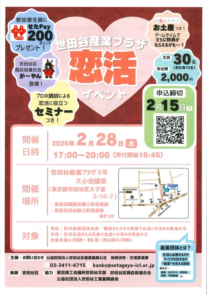 (公財)世田谷産業振興公社では、素敵な出会いを応援する「恋活イベント」を開催いたします。
